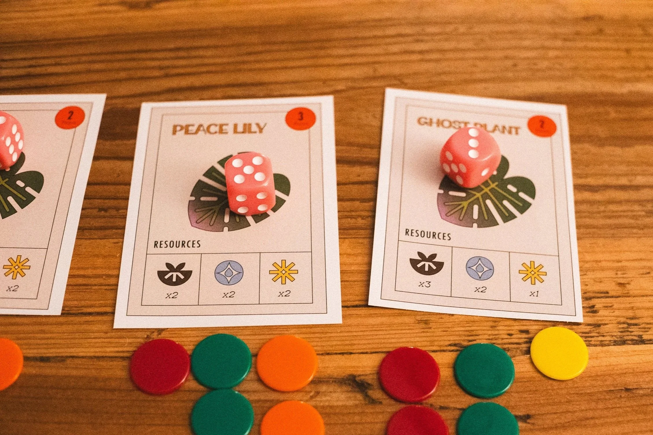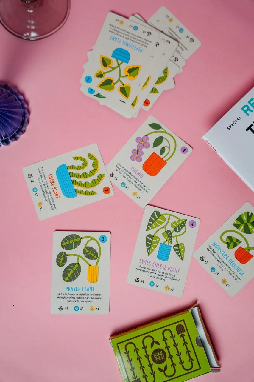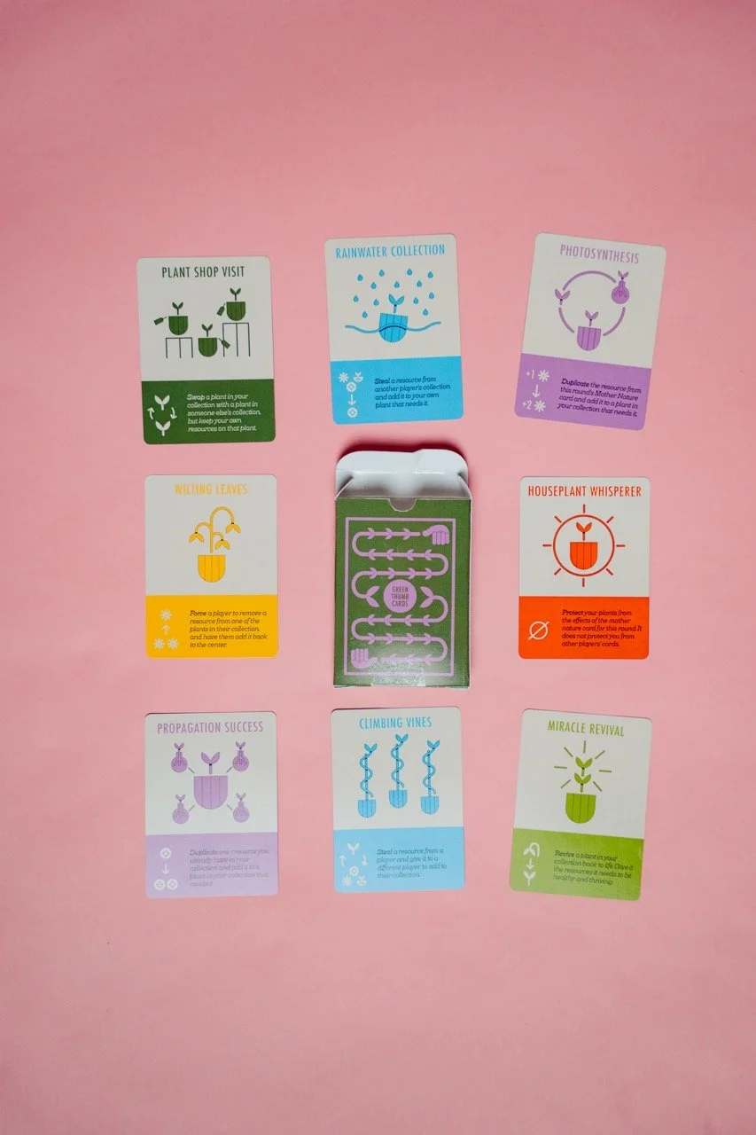Designing the cards was the biggest part of the process. I started with the houseplant cards, which are the centerpiece of the game. I wanted each illustration to be funky, organic, and colorful, but still clear in showing what resources the plant needed. Through a few iterations, I refined the style and layout—adding color-coded icons on a blank background to make them easy to scan during gameplay. These cards helped shape the look for the rest of the game.