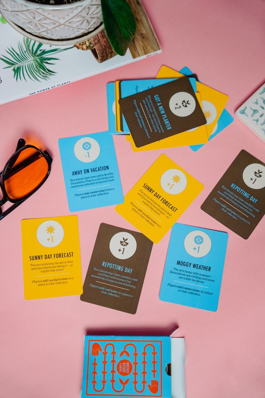 For the Mother Nature cards, I kept things super simple since their purpose is just to tell players what resource to gain or lose. I skipped illustrations and used a single-color design to match the associated resource. The Green Thumb cards took more tweaking—they started out too bold and distracting. I eventually switched to monochromatic illustrations that matched the houseplant style and included a small plant on each to tie them back to the main mechanic. In total, I designed 42 unique cards, each tailored to support gameplay in a clear and intentional way.
