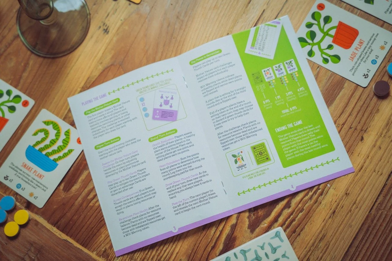 Beyond the cards, I also designed the box, tokens, rulebook, and score pad. I focused on consistency, using repeating shapes and patterns, like vines and pots, and made sure everything visually pointed back to the cards as the main feature. I studied other game boxes for inspiration and included all the expected details—like player count, age range, and playtime—while keeping the visual system cohesive throughout.